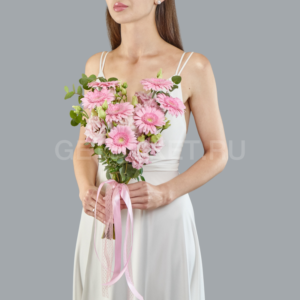 Букет невесты из розовых гербер, эустомы и гортензии