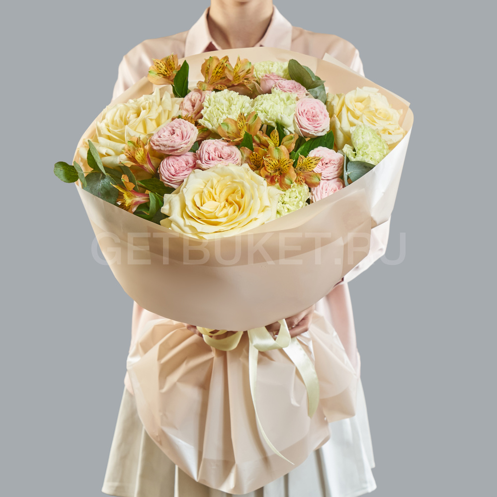 Букет с гвоздиками, розами и альстромерией