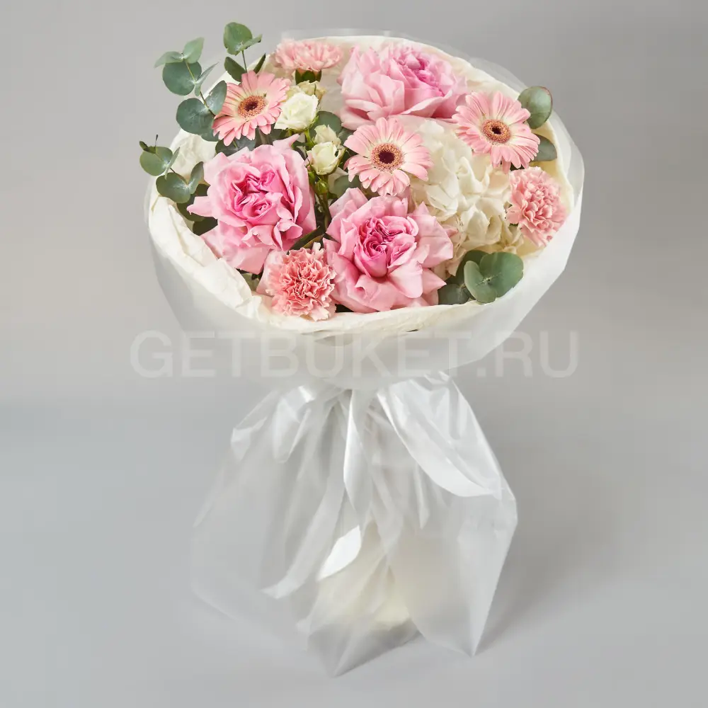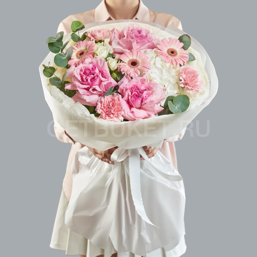 Букет из роз, гвоздик и розовой гортензии с эустомой12 590Букет из роз, гвоздик и розовой гортензии с эустомой 12 590 -