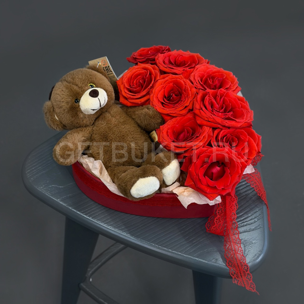 Цветочная композиция из красных роз с мишкой и валентинкой
