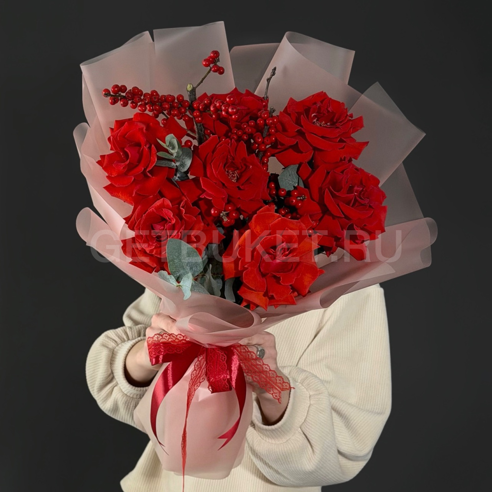 Алый букет красных роз с илексом и эвкалиптом