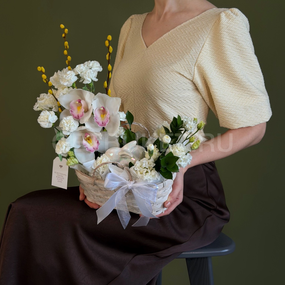 Цветочная композиция из гвоздик, орхидей и вербы с эустомой в плетеной корзине