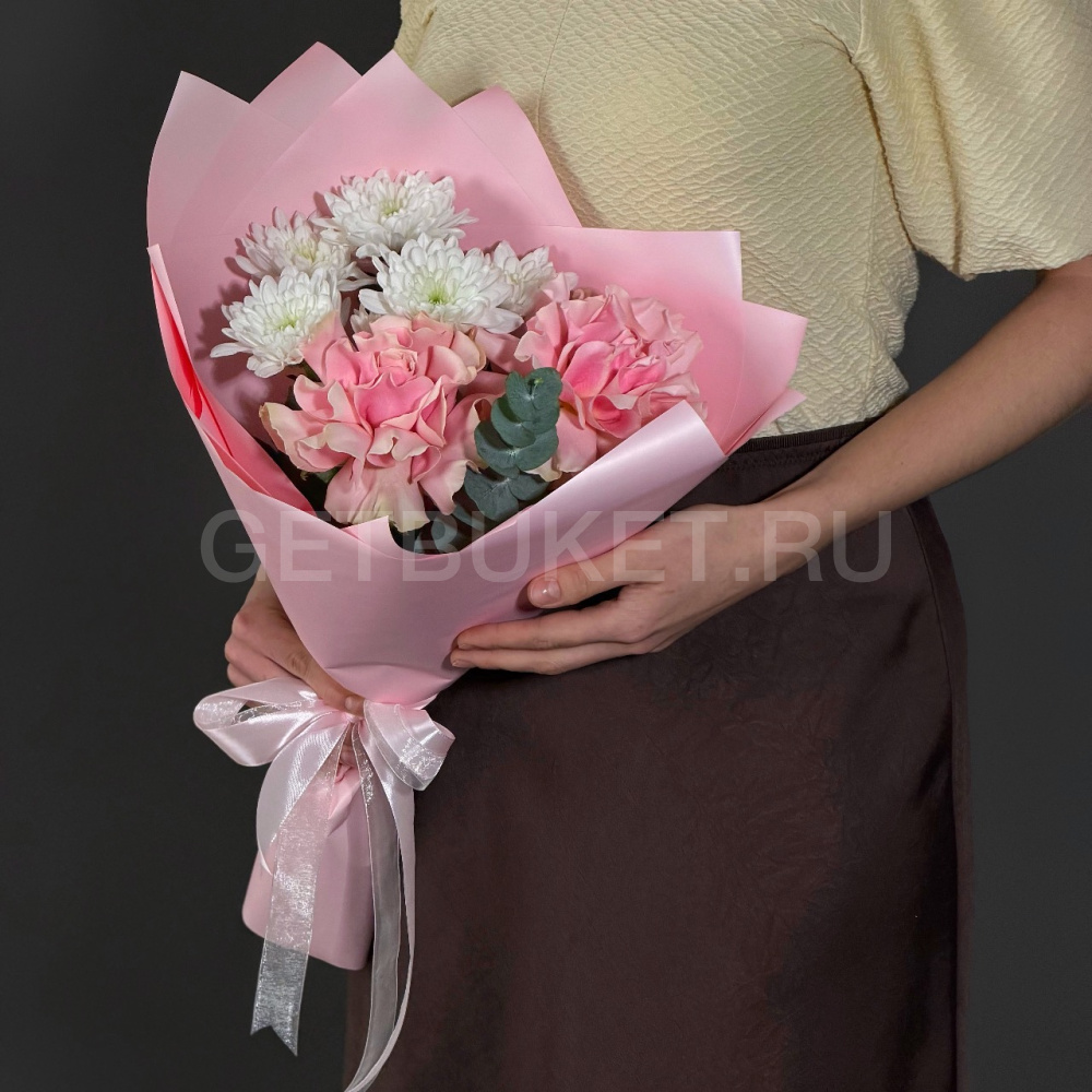 Букет из роз с хризантемами и эвкалиптом