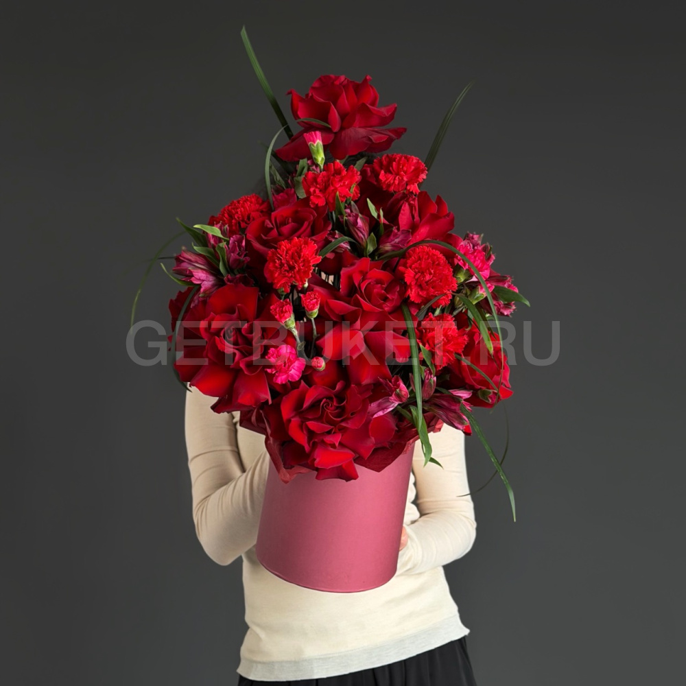 Цветочная композиция из красных гвоздик и роз с берграссом в шляпной коробке