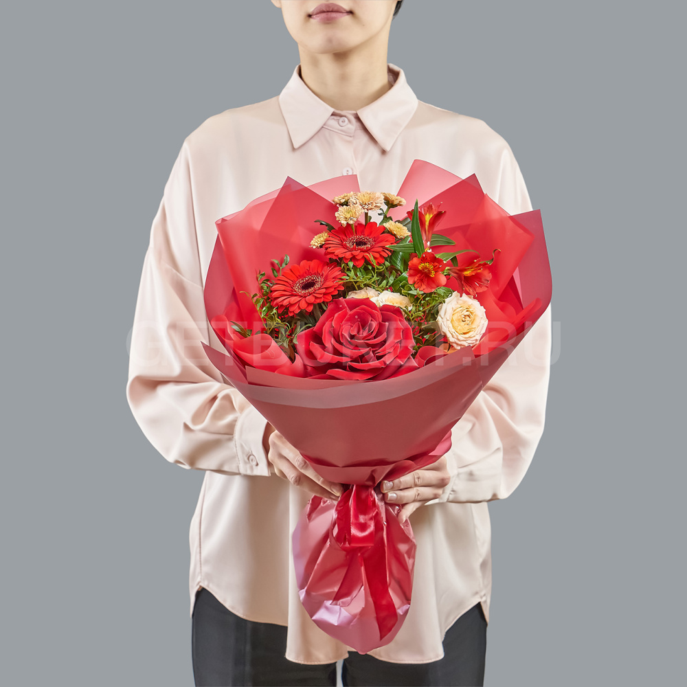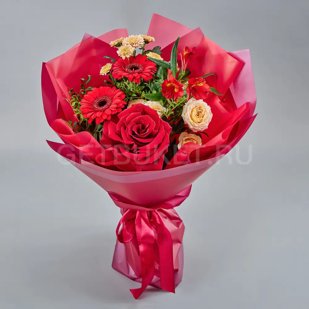 Ярко-красный букет из гербер, роз и хризантем4 050Ярко-красный букет из гербер, роз и хризантем 4 050 -