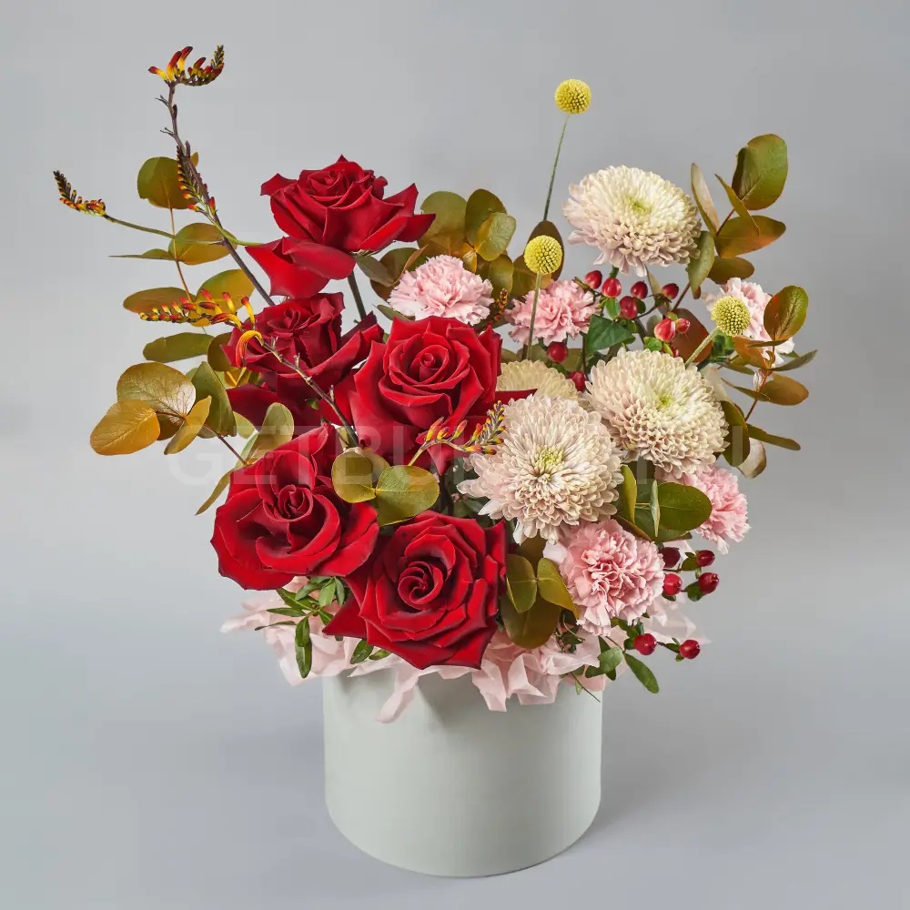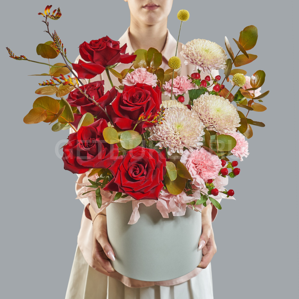 Цветочная композиция из роз, хризантем и гиперикума с краспедией в шляпной коробке