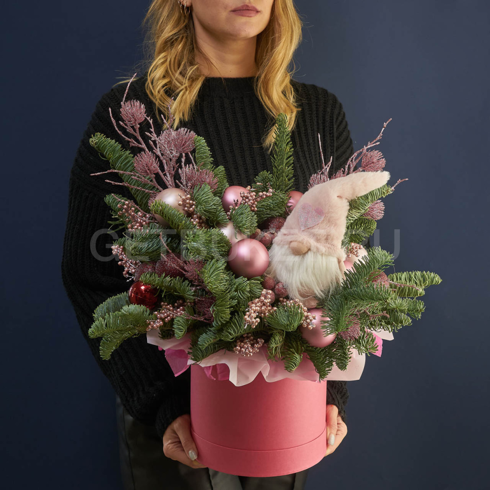 Новогодняя композиция в шляпной коробке из нобилиса с гномом