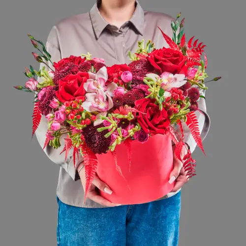 Цветочная композиция из роз, хризантем и гиперикума с краспедией в шляпной коробке7 330 ₽Цветочная композиция из роз, хризантем и гиперикума с краспедией в шляпной коробке 7 330 ₽ -